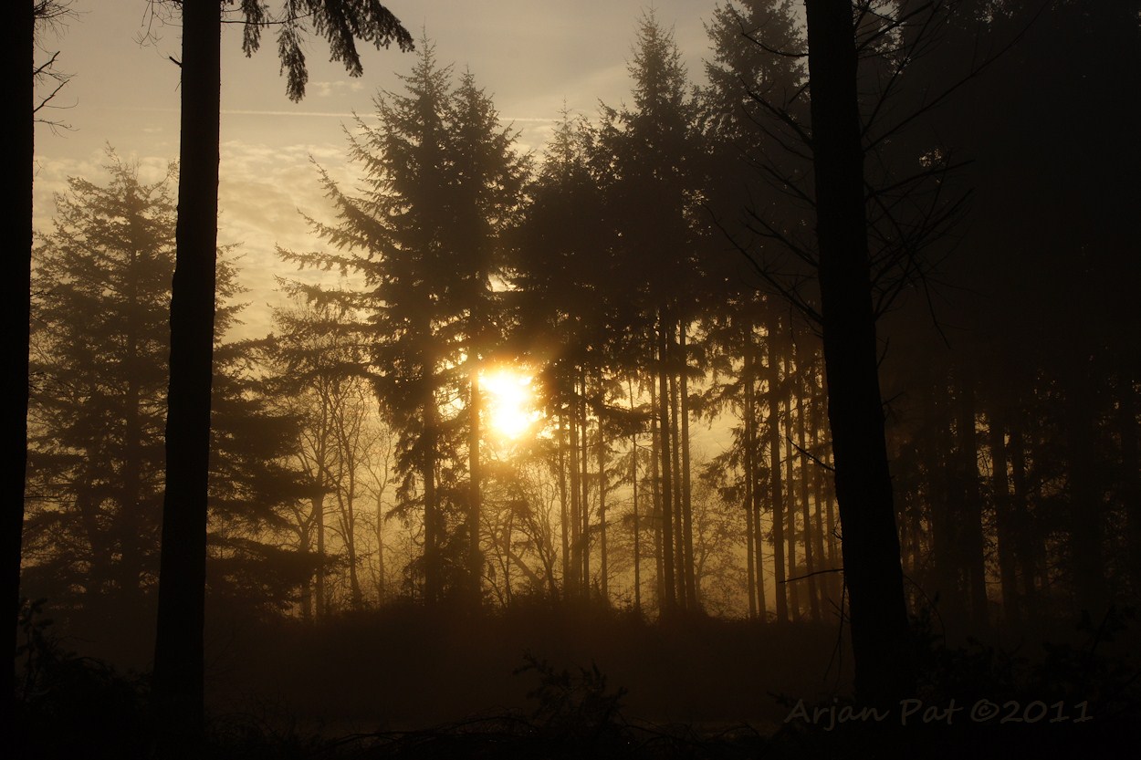 Wandeling op en rond Boswachterij Odoorn, met o.a. bomen bij een mistige zonsopkomst en reeën.