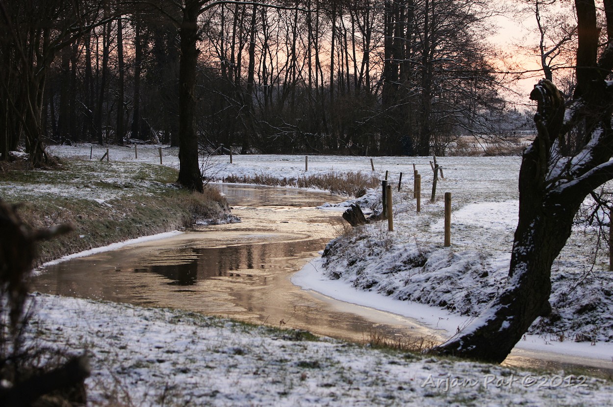 Drentse AA lijkt op veel plekken bevroren, maar onder het ijs stroomt het water nog steeds, dus niet betrouwbaar om eroverheen te lopen.