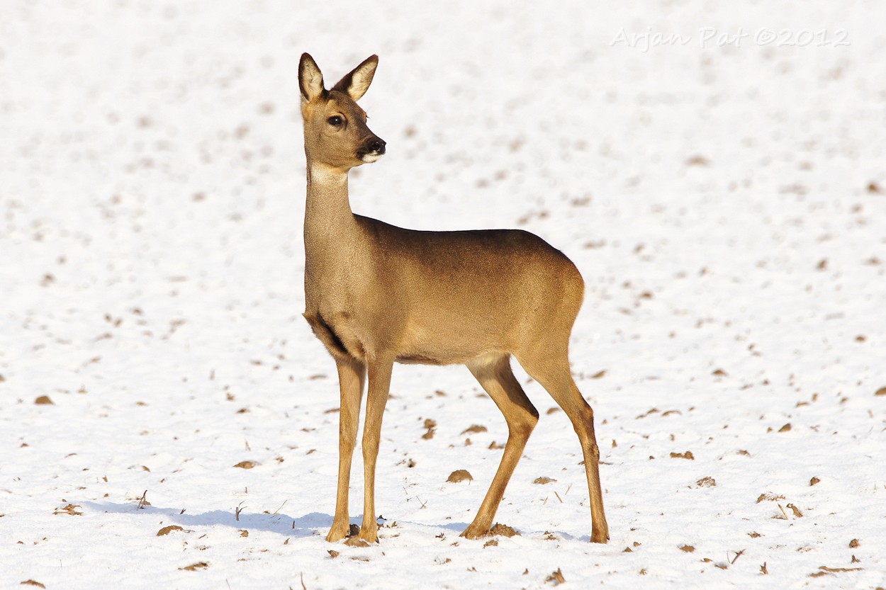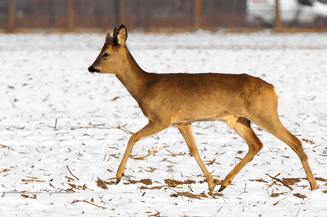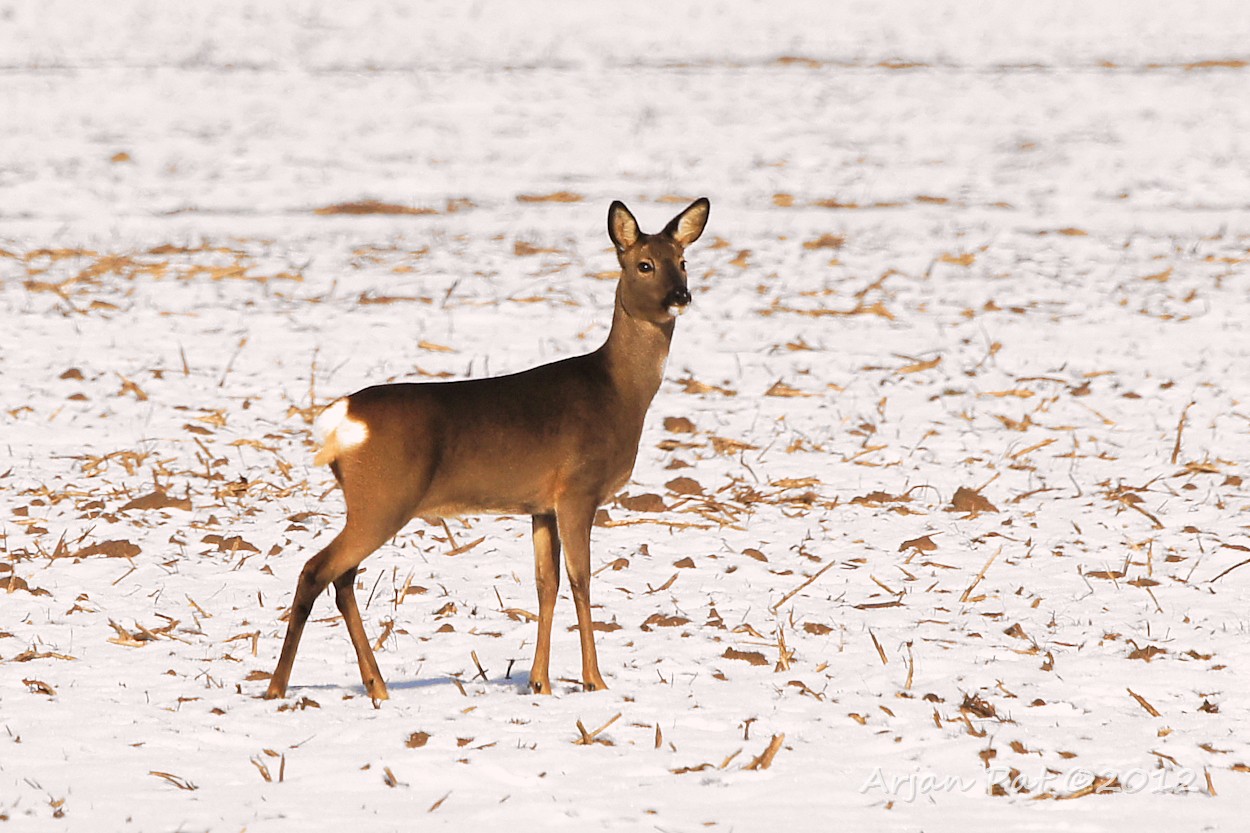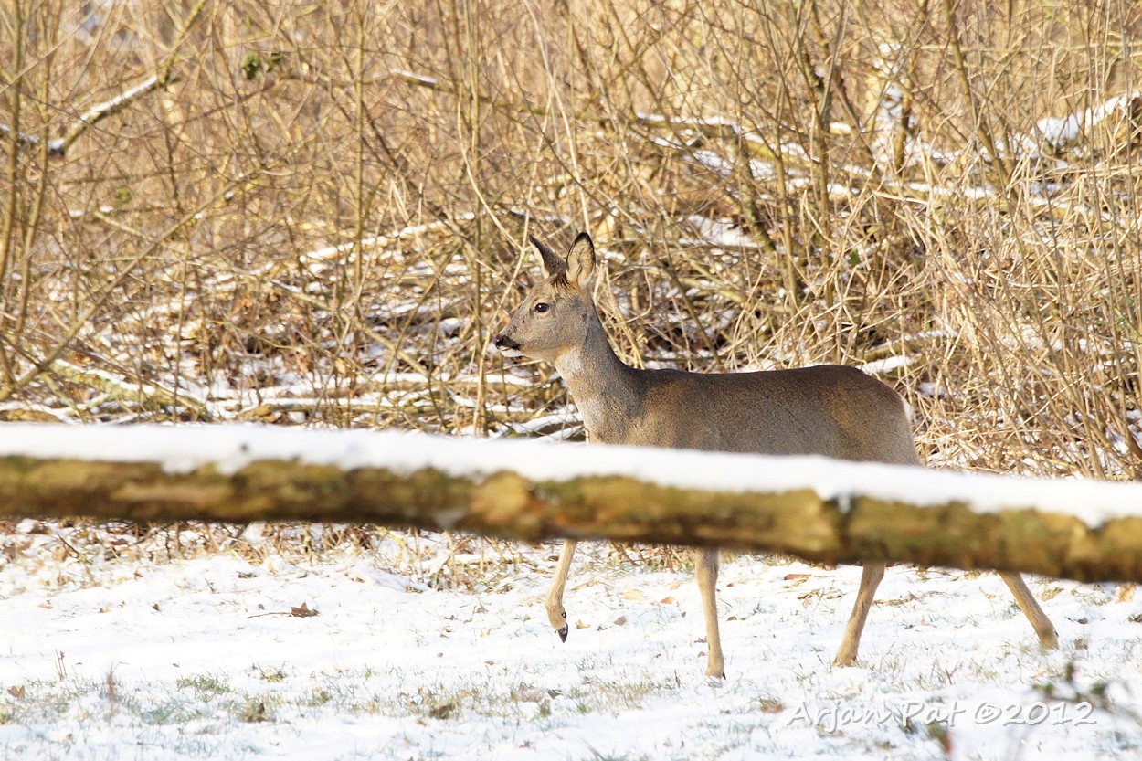 Het gebeurt niet vaak, in deze barre wintertijd, dat je een ree in z'n eentje rond ziet lopen. Deze kwam net achter mij het bos uitgelopen en was op de landerijen op zoek naar lekkernijen.