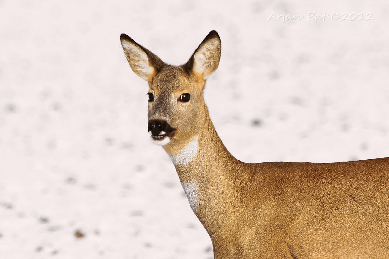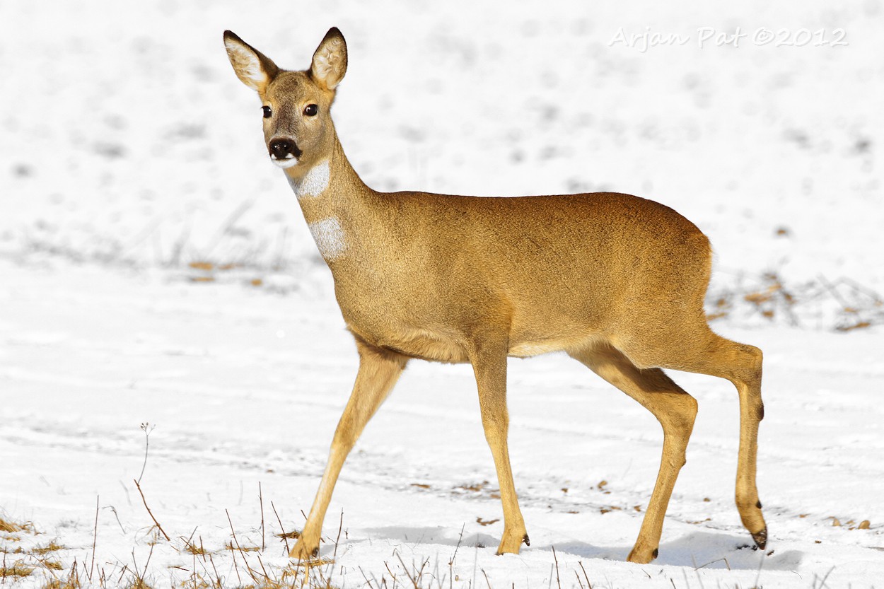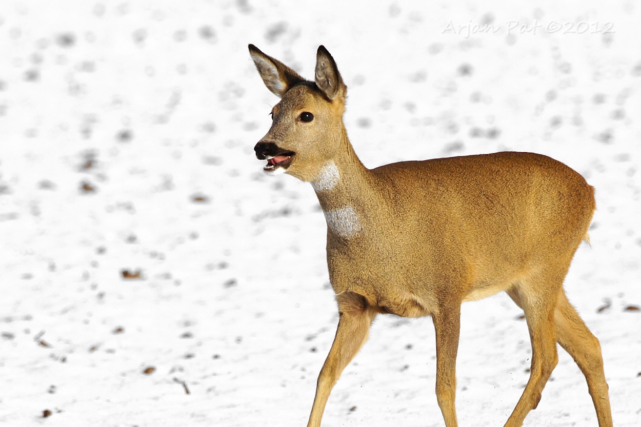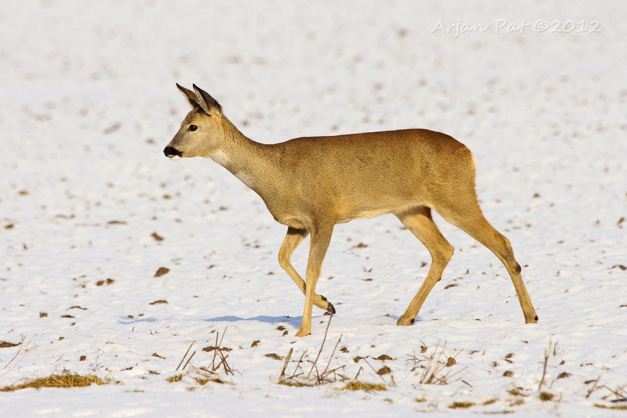 Het gebeurt niet vaak, in deze barre wintertijd, dat je een ree in z'n eentje rond ziet lopen. Deze kwam net achter mij het bos uitgelopen en was op de landerijen op zoek naar lekkernijen.