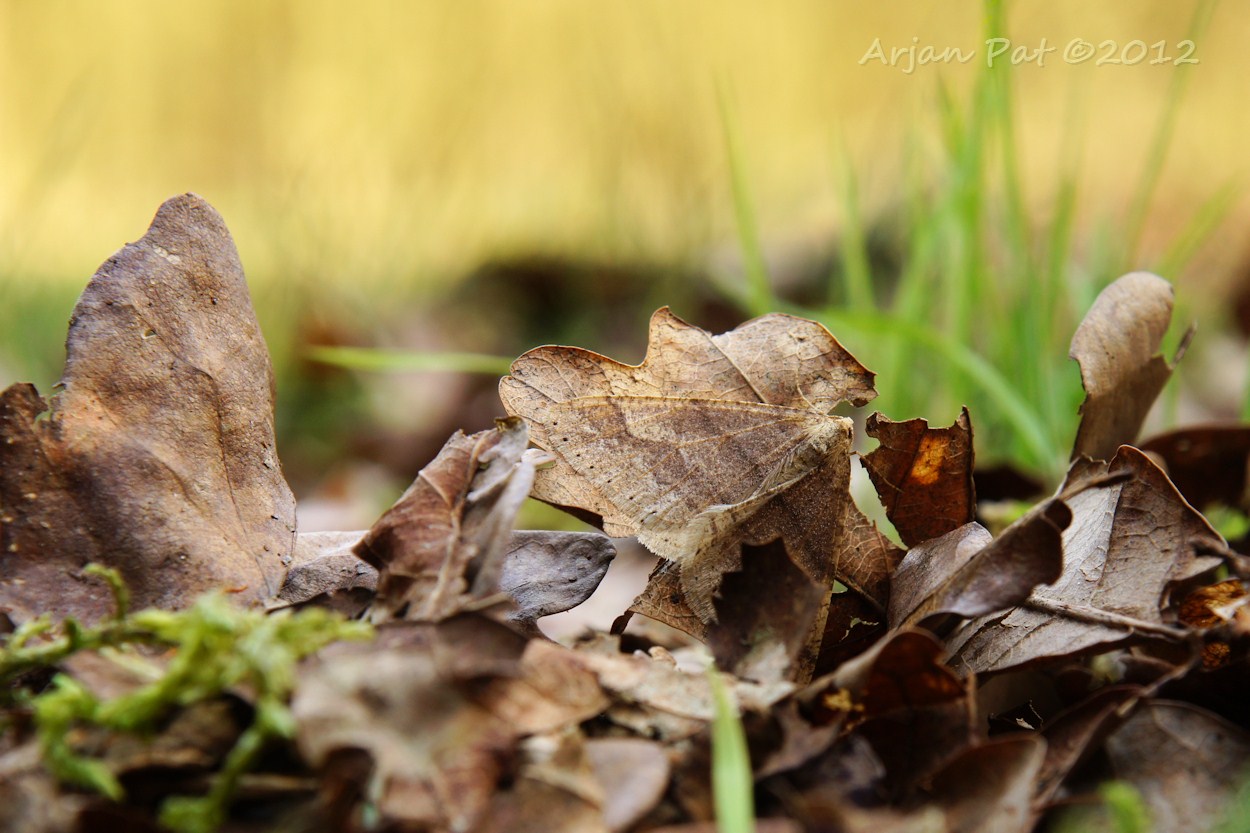 Nachtvlinder (een spanner) zeer goed gecamoufleerd op een dood blaadje.