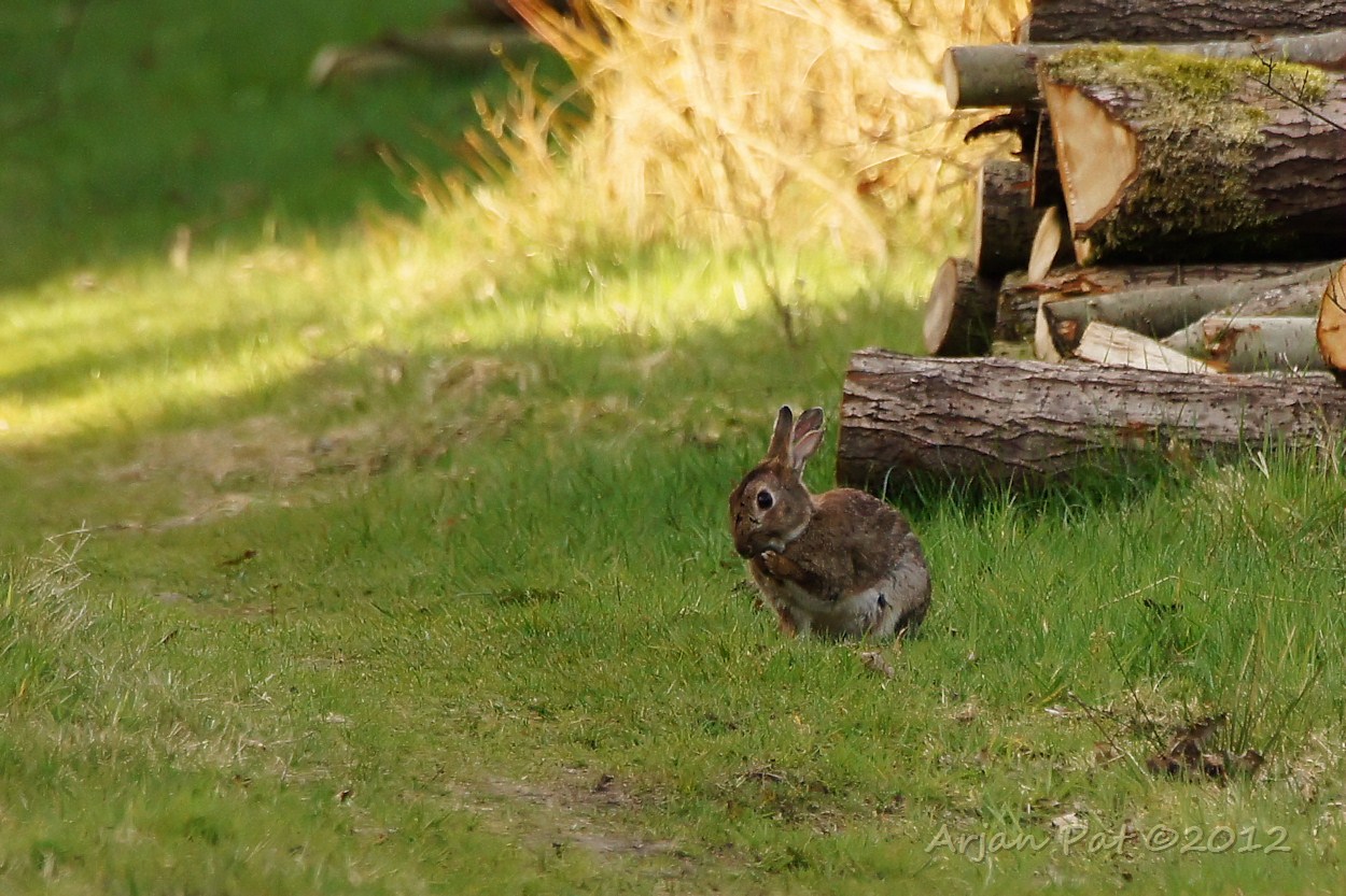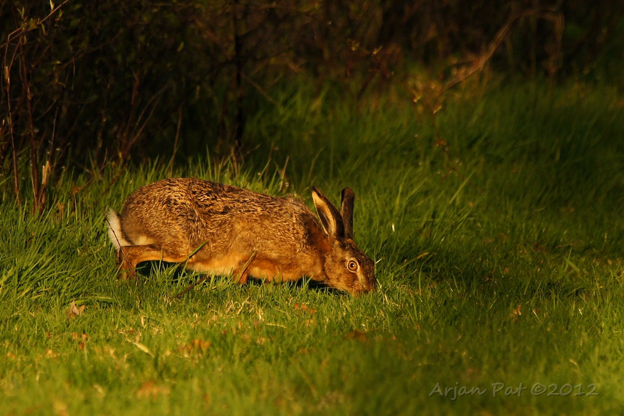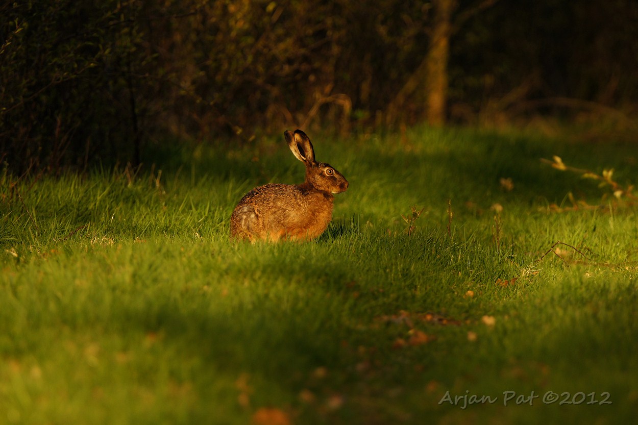 Haas komt langzaam uit de bosjes om van de laatste zonnestralen te genieten.
