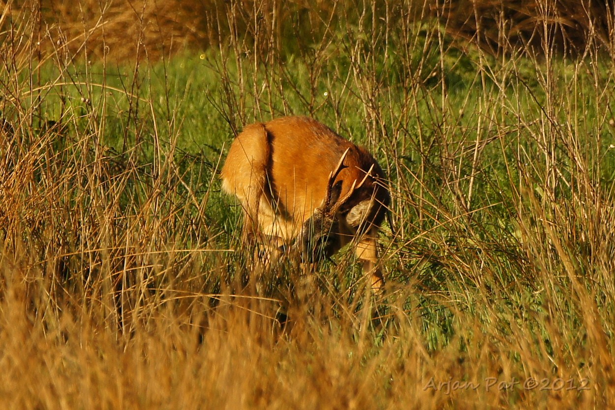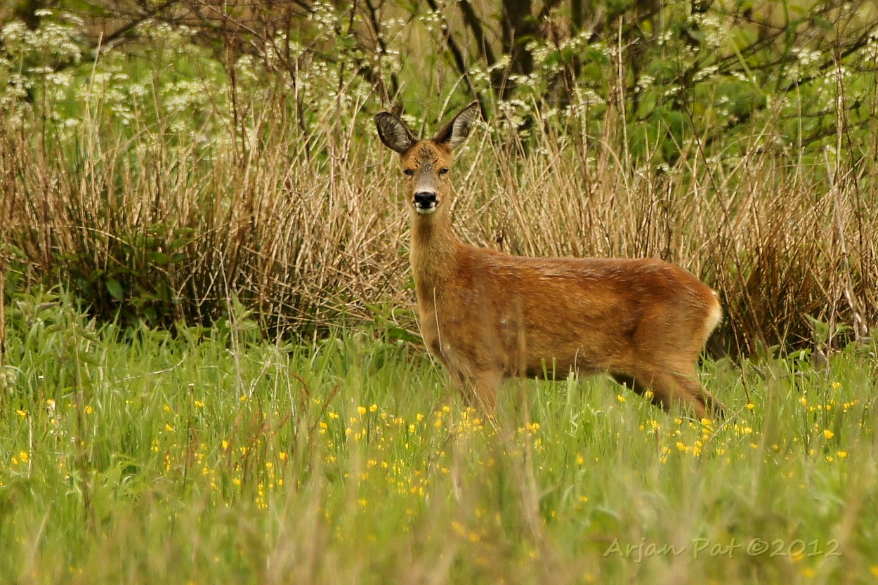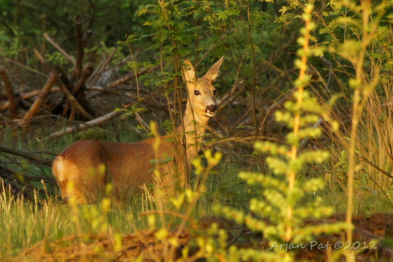 Een ree aan de ene kant van de begroeiing en ik aan de andere. Ik zag haar al ver van te voren voor mij aan lopen. Langzaam maar zeker kwam ik dichterbij en kwam zo'n beetje oog in oog te staan met deze reegeit.