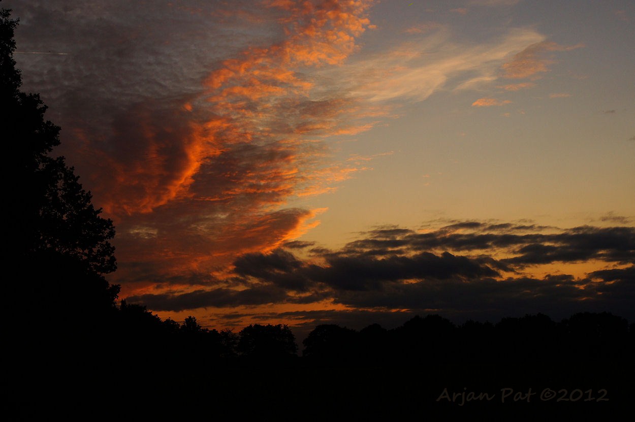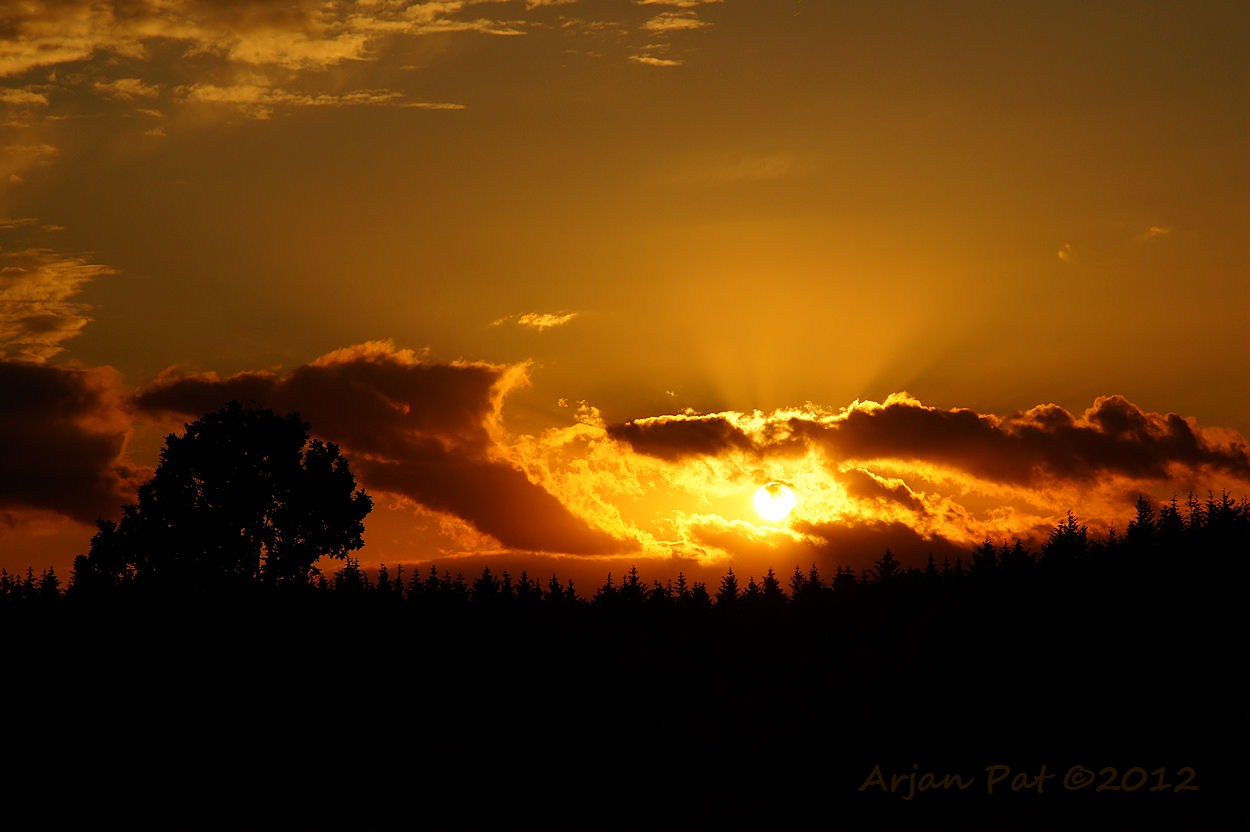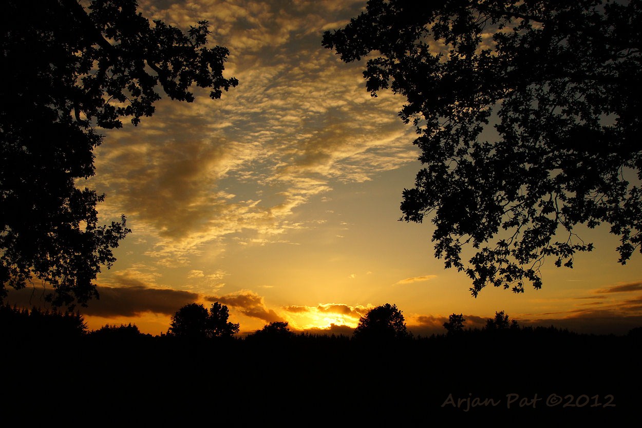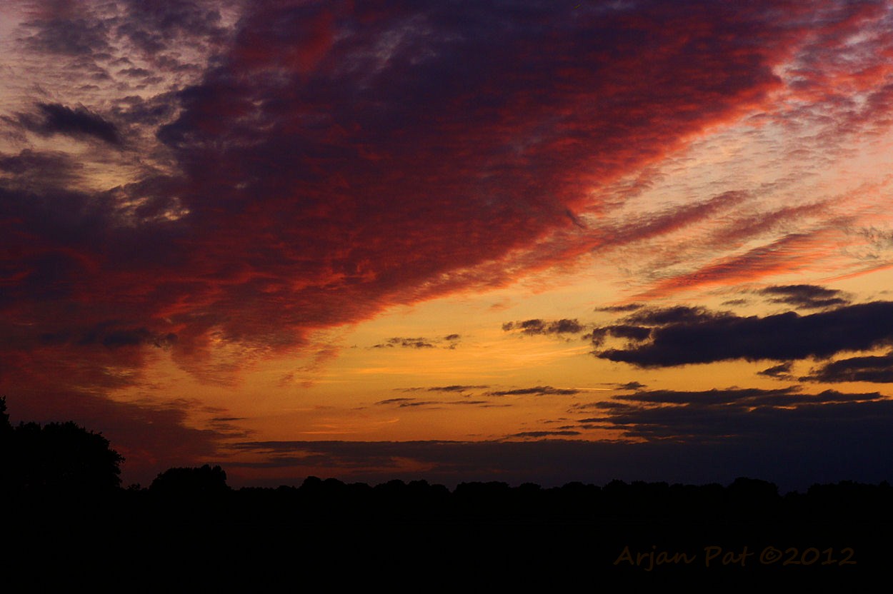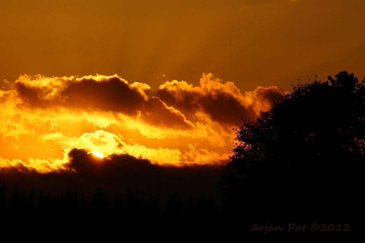 Zon schijnt mooi rood, onder de wolken door.