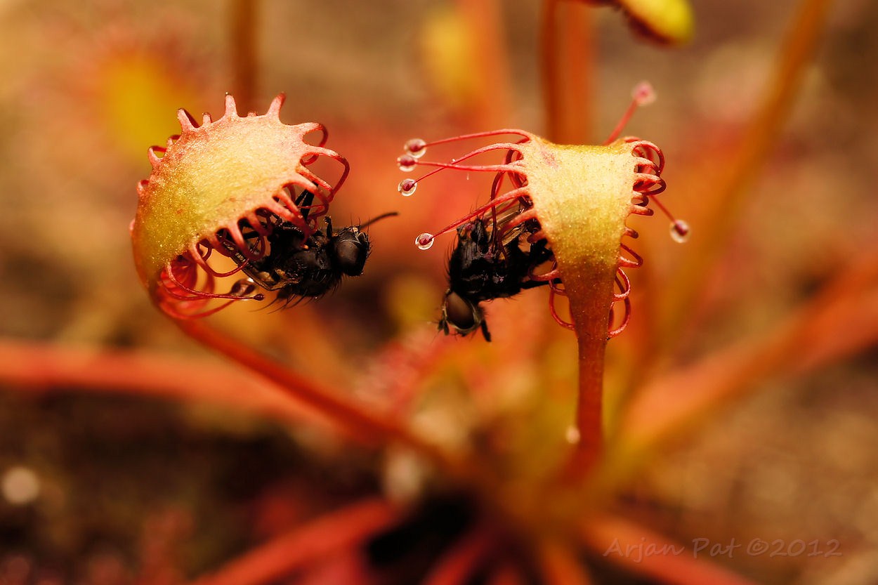 'Lekker dauwtrappen'. Deze twee vliegen zijn echter met hun slaperige kop tegen de verkeerde dauw aangelopen; nu zitten ze gevangen (en half verteerd) in de armen van de kleine zonnedauw.