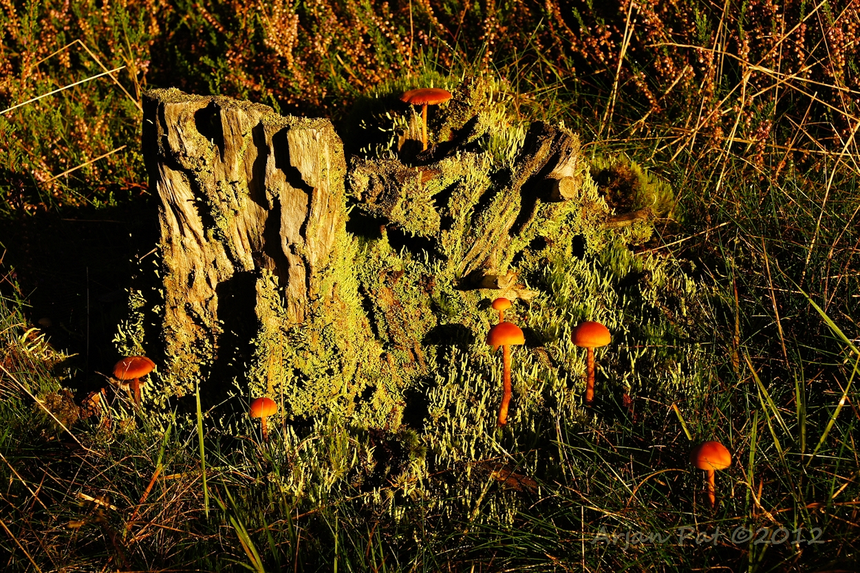 Oude boomstronk met bekermos en paddenstoelen.